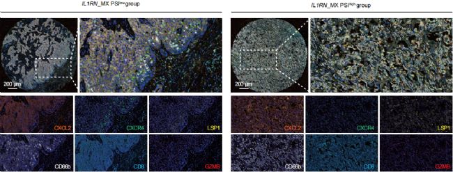 圖:與IL1RN_MX PSIlow KRAS突變樣本相比,IL1RN_MX PSIlow KRAS突變樣本的CXCR4+和LSP1+中性粒細胞密度略有下降,而CXCL2+中性粒細胞和GZMB+CD8+T細胞密度增加