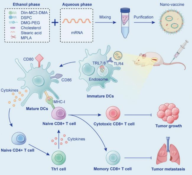 該研究表明,mRNA 抗原和適當的 TLR 激動劑的共同遞送可以通過協同免疫刺激和Th1免疫反應顯著提高脾靶向 mRNA 疫苗的抗腫瘤免疫治療效果。