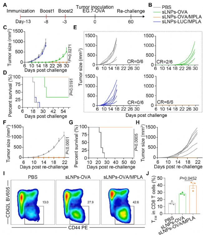 在預防性小鼠模型中,sLNPs-OVA/MPLA誘導了一種有效的抗原特異性細胞毒性T細胞免疫反應,并最終通過持久的免疫記憶保護阻止了EG.7-OVA腫瘤的生長。