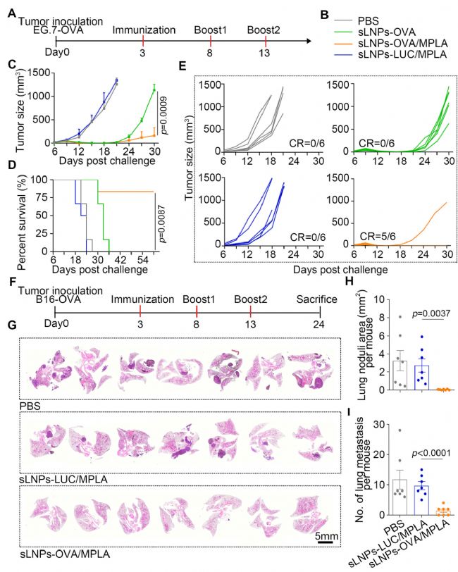 此外,sLNPs-OVA/MPLA有效延緩了EG.7-OVA皮下移植淋巴瘤的腫瘤生長和B16F10-OVA靜脈注射黑色素瘤的肺轉移形成。