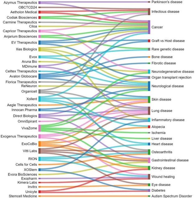 圖4. 有潛力的外泌體治療公司和靶向的疾病類型