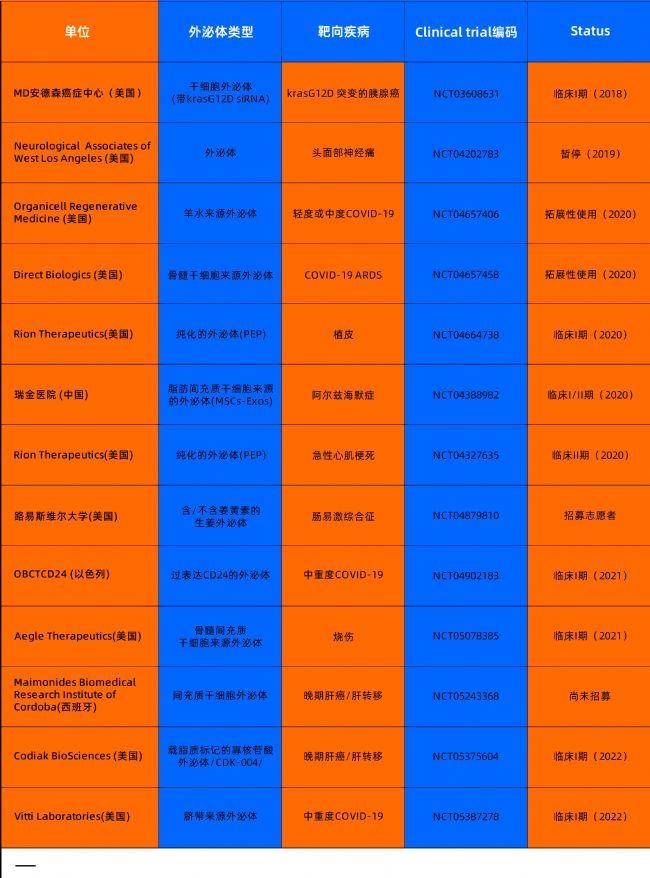 表1. 外泌體治療性臨床試驗(部分)