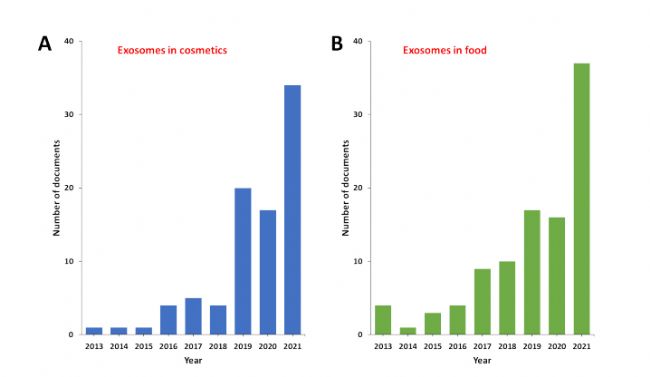 圖5. CAS數據庫中與化妝品(A)和食品(B)中外泌體應用相關的文獻發(fā)表趨勢