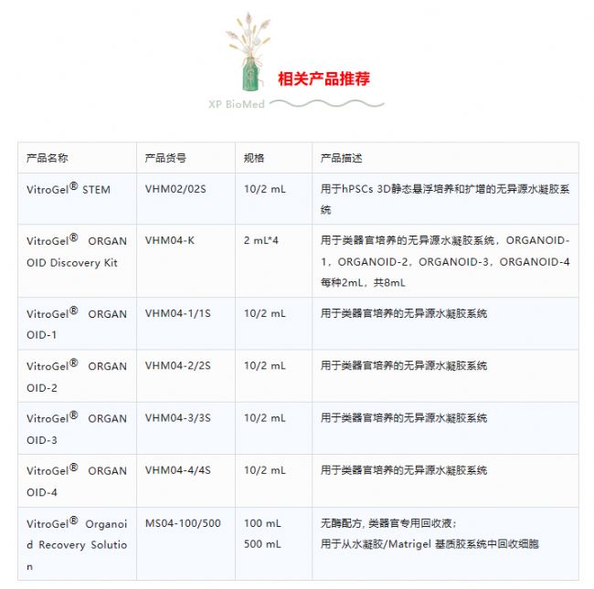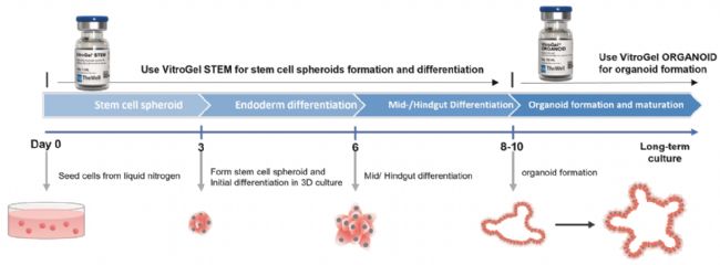 一種無異源水凝膠可以很好地解決動物源基質的問題,VitroGel STEM 和VitroGel ORGANOID從 hPSC 生成和培養中腸/后腸和類器官(圖 1)。