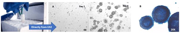 VitroGel STEM能夠支持凍存hPSC復蘇培養和擴增,形成3D hPSC細胞球狀體(圖3)。傳統方法需要在hPSC細胞復蘇和穩定后,在基質上多次傳代培養。在復蘇過程中,保持復蘇的hPSC的活力通常具有挑戰性。然而,VitroGel STEM消除這一困難,可以直接從液氮中取出細胞復蘇進行培養,保持高的細胞活力,產生3D細胞球。