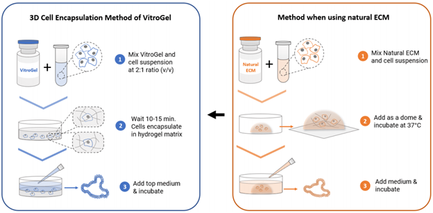 VitroGel STEM和VitroGel ORGANOID均不含異源成分,可提供強大的細胞擴增和分化支撐。VitroGel可以克服當前用于干細胞培養和類器官生成的ECM的缺點 :