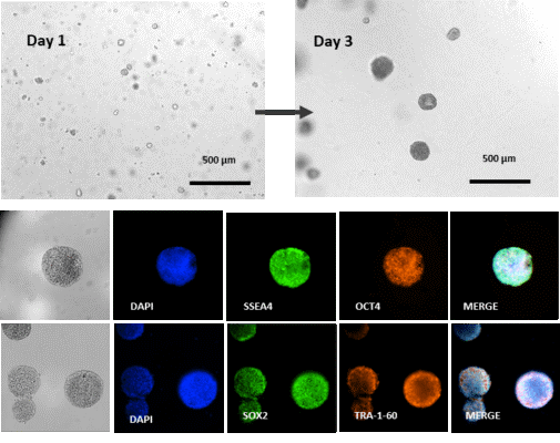 圖7 3D hPSC 球狀體中關鍵多能標記物的表達。(上)3天后,形成約100 μM的hPSC球狀體。(下)高質量的hPSC球狀體在3 d內形成,并表達關鍵的多能性標志物SSEA4、OCT4、SOX2和TRA-1-60。