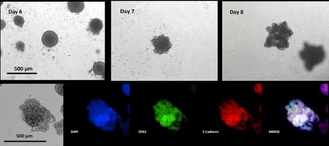 圖8 分化過程中內胚層球狀體(第 6 天)和中/后腸(第 7 天和第 8 天)類器官的形態。(上)分化過程中內胚層球狀體(第6天)和中/后腸(第7天和第8天)類器官的形態。(下)中/后腸類器官表達關鍵標志物CDX2和上皮標志物E-Cadherin。