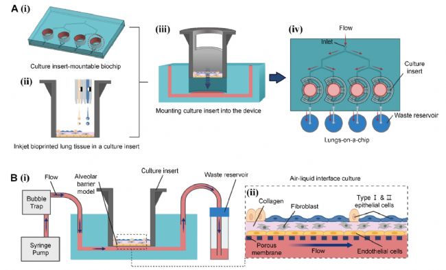 ▲ 圖1 用于安裝包含生物噴墨打印的肺泡屏障組織的培養插件的微流控系統的示意圖。A(i) PDMS培養插件可安裝的生物芯片,(ii)在組織培養插件中噴墨打印人體肺泡活細胞,(iii)將含有活組織的培養插件安裝到PDMS芯片中,(iv)在安裝四個插件后向肺類器官芯片灌注培養基。B (i)包括流體系統的肺類器官芯片的橫截面示意圖和(ii)芯片上的肺泡屏障組織的橫截面示意圖。