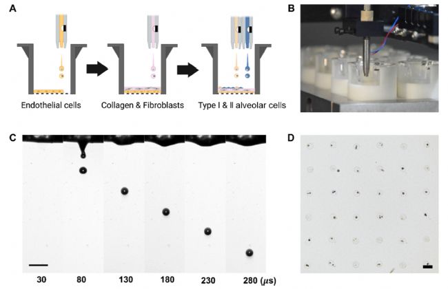 ▲ 圖2 利用噴墨生物打印技術制備肺泡屏障模型。(A)肺泡屏障模型的順序打印過程示意圖。(B)壓電噴墨打印機單噴頭的自動組織打印過程的圖像。(C)噴射載細胞液滴的高速頻閃圖像。比例尺:100μm。(D)打印在基底上的6×6載細胞液滴陣列的代表性圖像。比例尺:200μm。