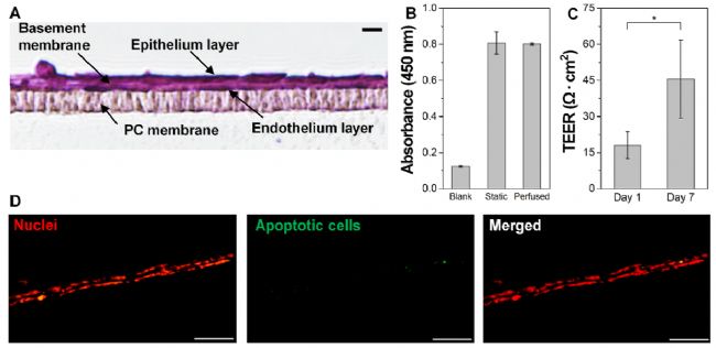 ▲ 圖3 (A)聚碳酸酯(PC)多孔膜對肺泡屏障組織切片的H&E染色。比例尺:10μm。(B)在孔板(靜態)和微流控裝置(灌注)上培養的生物打印組織上,使用CCK-8實驗的細胞增殖率比較。“空白”用一個無細胞的Transwell插件進行測試。(C)芯片上培養的肺泡屏障組織的TEER值測定。(D)用TUNEL檢測試劑盒處理的肺泡屏障組織的熒光圖像。凋亡細胞呈綠色,正常細胞呈紅色。比例尺:100μm。