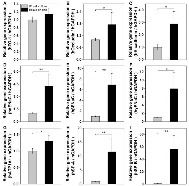 為了分析肺泡屏障組織的功能基因,進行了2D細胞培養模型和芯片上噴墨生物打印模型之間的代表性肺泡基因表達譜的比較,如圖4所示,包括表達緊密連接蛋白(ZO-1、occludin和E-cadherin)、離子通道(α-ENaC、β-ENaC和γ-ENaC)、離子輸送泵(ATP1A1)和表面活性劑蛋白(親水性SP-A和疏水性SP-B)的基因,這些基因參與肺泡屏障的關鍵功能,包括屏障形成、液體清除和表面活性劑分泌。結果表明,在芯片上噴墨生物打印的組織中,呼吸道上皮屏障的完整性得到了改善,可以更準確地反映肺功能。