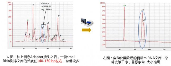 Small RNA是一類長約20~30個核苷酸的非編碼RNA分子,包含miRNA 、siRNA和piRNA等,是一大類調控分子,幾乎存在于所有的生物體中。因此如何準確回收small DNA,減少其他非目標DNA就成為實驗的關鍵因素。small RNA文庫加上adapter接頭后其長度一般在140-150bp左右,前后存在大量雜帶,用Blue Pippin系列產品可以精準回收相關片段,將雜帶徹底去除干凈,有效提高測序質量和效率。(圖1)