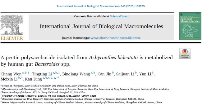 Wen C, Li T, Wang B, Jin C, Li S, Li Y, Li M, Ding K. A pectic polysaccharide isolated from Achyranthes bidentata is metabolized by human gut Bacteroides spp. Int J Biol Macromol. 2023 Jul 13;248:125785. doi: 10.1016/j.ijbiomac.2023.125785IF: 8.2 Q1 . Epub ahead of print. PMID: 37451376IF: 8.2 Q1 .