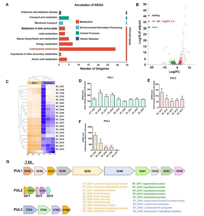 對在含有A23-1或葡萄糖的MM培養基上生長的BT進行了RNA-seq。結果顯示,大多數基因與碳水化合物代謝相關。進一步分析發現,總共有394個基因在BT生長于A23-1時表現出表達變化。在394個上調基因中,有19個與BT在葡萄糖上生長相比表現出大量增加。這19個上調基因被分為3個離散的PULs,并通過qPCR證實。為了更好地顯示這些PULs,根據Bacteroides thetaiotaomicron VPI-5482(Geneback accession number: AE015928.1)的基因注釋,繪制了每個PUL的示意圖。PUL1由10個基因組成,編碼假設蛋白和兩對SusC和SusD。PUL2由5個基因組成,編碼假設蛋白。PUL3由4個基因組成,參與鼠李糖代謝。本研究中的PULs與典型的PUL不同,后者包含SGBP、SusC和SusD、糖苷水解和轉錄調節子。這些PUL中編碼的大多數蛋白是假設蛋白,這與以前的報告不同。研究這些假設蛋白質的功能可能具有重要意義,但它們的詳細功能應該在未來得到解決。