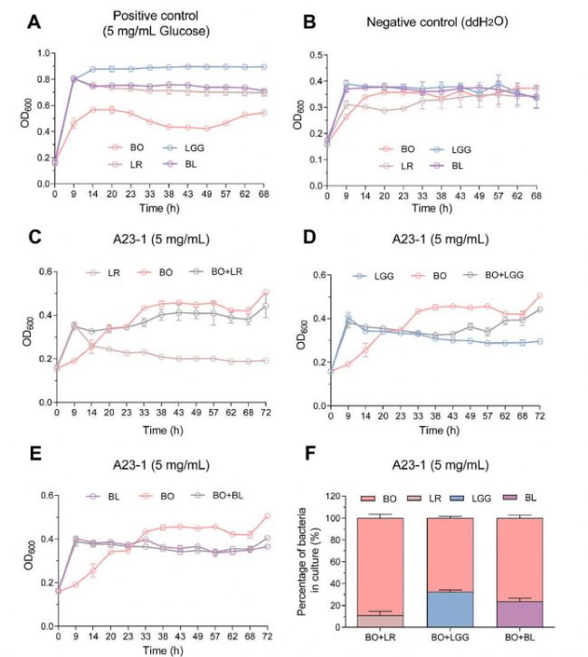 在添加或不添加碳源的條件下,分析了BO和益生菌在MCB培養基中的生長情況。結果顯示,在添加5mg/mL葡萄糖的條件下,BO和益生菌的生長良好,OD600值超過0.5;而在不添加碳源的條件下,它們的OD600值不到0.4。在添加A23-1的情況下,我們發現BO作為單一菌種可以在A23-1上生長良好,最大OD600值約為0.5,而益生菌作為單一菌種在A23-1上的生長不佳,尤其是LR。BO和益生菌的混合培養物的OD600值介于單一菌種之間或等于益生菌。這些結果表明它們之間可能不會發生交叉喂養。還分析了混合培養物中每個菌種的百分比。結果顯示,益生菌在混合培養物中的百分比下降,而BO的百分比增加。這與生長曲線的結果一致。然而, BO作為單一菌種在A23-1上生長良好,而混合培養物則生長不佳。BO和益生菌之間的相互作用機制尚不清楚。