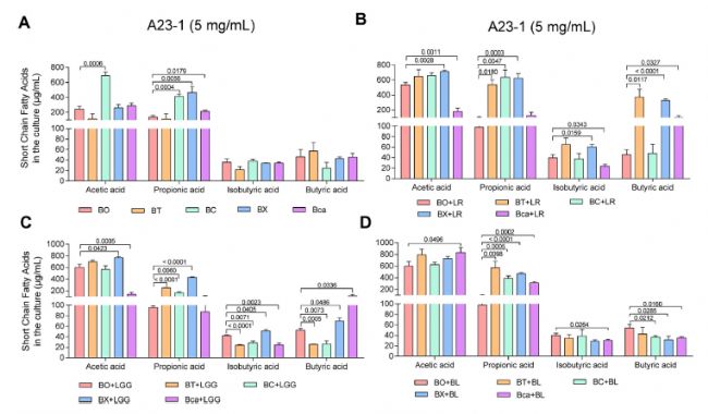 飲食攝入纖維與增強SCFAs的產生有關,多糖作為纖維之一可以被腸道微生物群利用來產生SCFAs。之前已經報道過人類腸道擬桿菌和益生菌可以利用多糖產生SCFAs。檢測了HGM利用A23-1產生SCFAs的情況。擬桿菌主要產生乙酸和丙酸,與BO菌株相比,BC產生乙酸顯著增加(p = 0.0006),但產生的丁酸和異丁酸較少。分別分析了擬桿菌與益生菌混合培養物產生的SCFAs,并將p值列在柱狀圖上。結果顯示混合培養物也產生更多的乙酸和丙酸。A23-1對宿主的生物活性是否由SCFAs引起仍是未知的。綜上所述, A23-1可以被HGM代謝產生SCFAs,尤其是乙酸和丙酸。