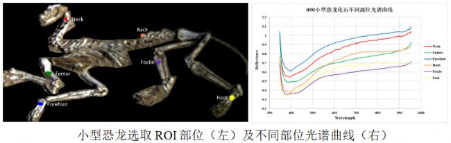 不同化石的光譜差異很大,同一化石上的不同部位由于土壤長期掩埋、微生物侵害或地面以上部位遭受風化侵蝕等因素,其光譜也不盡相同,小型恐龍化石不同部位的光譜差異如下: