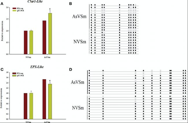 (D) AsVSm組和NVSm組EPX-Like基因啟動子區平均甲基化水平。* p < 0.05。