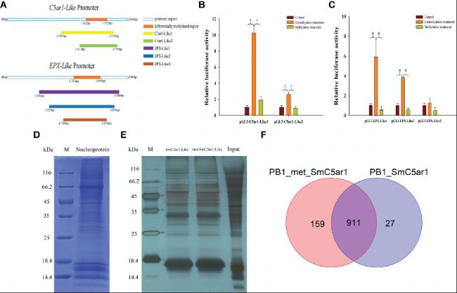 (C) DNA甲基化修飾對EPX-Like啟動子區熒光活性的影響。*代表性顯著性差異(P<0.05)。