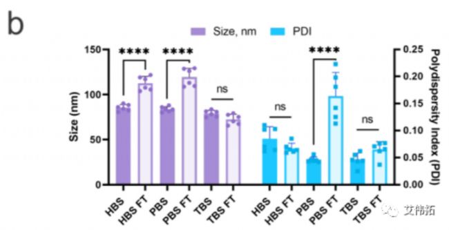 HEPES和Tris中LNPs的PDI在凍融前后基本保持一致,而PBS中LNPs在解凍后PDI增加了3倍(上圖b)。FT后Zeta電位也略有下降(上圖d)。