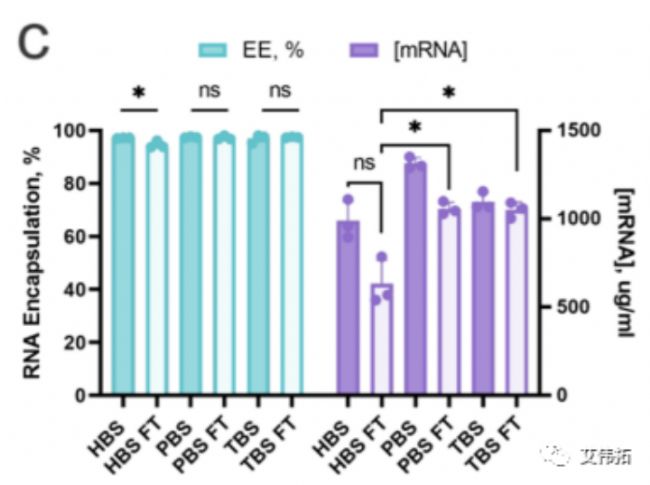 儲存在HEPES和PBS中的樣品在FT后的平均粒徑增大了約50%,而儲存在Tris中的LNPs的粒徑減小了約10 nm。