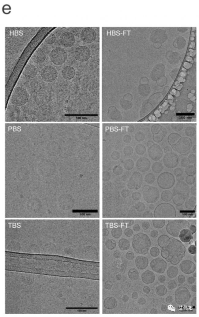 與新鮮LNPs相比,HEPES中的LNPs在凍融后出現獨特的沙漏狀結構,尺寸略大(見下圖e)。在LNPs周圍形成的水泡似乎缺乏mRNA,這可能表明HEPES可以影響mRNA周圍脂質的堆積,例如,HEPES可以促進脂質與mRNA之間更強的靜電相互作用——HEPES LNPs的zeta電位是真正的中性的,而PBS和Tris LNPs具有−2至−5 mV的輕微負電荷,這可能表明當HEPES存在時,mRNA電荷的中和作用更有效。