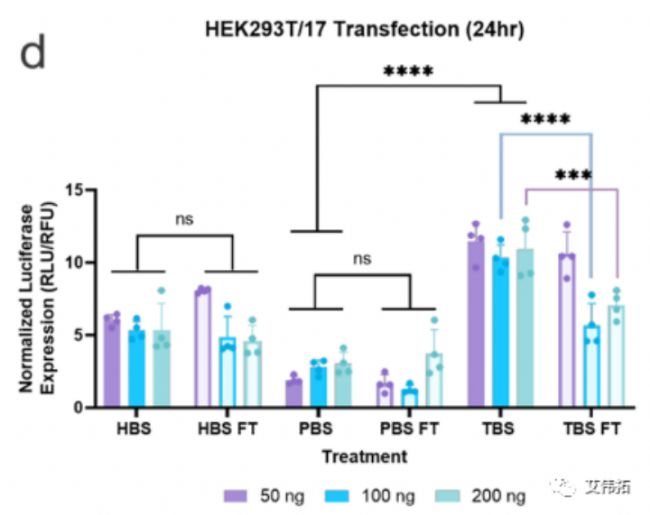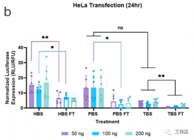 一般來說,所有的mRNA-LNP制劑在解凍后轉染效果都有所下降。在HeLa細胞中,PBS LNPs的轉染效率下降most為嚴重,在所有處理中平均下降4倍,而HEPES在所有處理中平均下降2倍(下圖b)。對于HEK293T/17細胞系, HEPES和PBS LNPs均無統計學意義的下降,而Tris在100和200 ng時的LNPs分別下降了2 ~ 2.5倍(下圖d)。