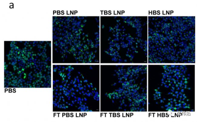 結果表明,通過體外和體內轉染衡量,在HEPES和Tris體系中的LNPs總體上優于PBS。與PBS相比,HEPES和Tris作為冷凍保護劑,可以在更大程度上保存LNPs的結構和mRNA的遞送效率。