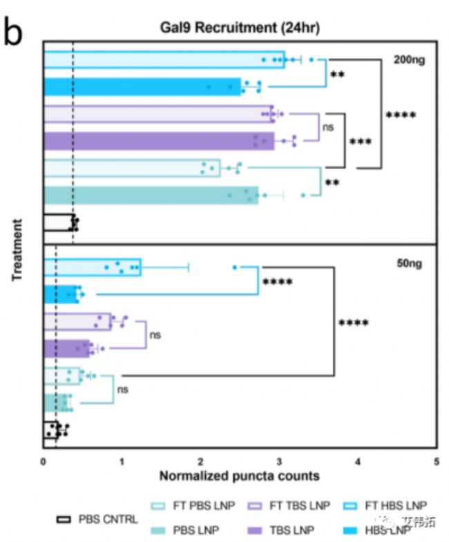 低劑量處理(50 ng)在所有新鮮LNPs中幾乎沒有變化,HEPES LNPs在FT后表現出most高的Gal9募集和mostoutstanding的變化(2.6倍)。