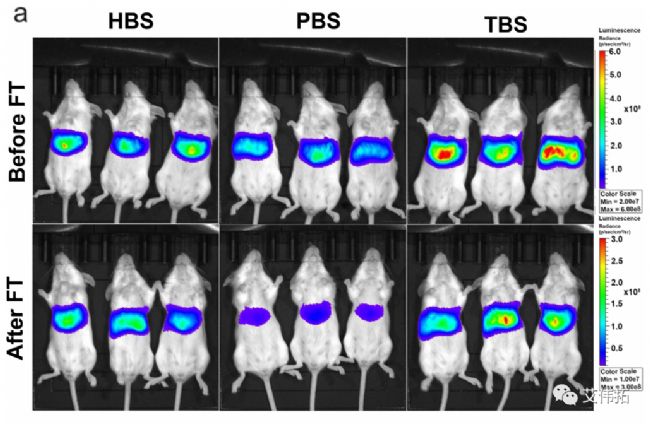 通過living body成像,探索了不同緩沖體系mRNA-LNP在體內的表達情況。將HEPES、Tris和PBS LNPs靜脈注射到年齡匹配的雌性BALB/c小鼠中,比較熒光素酶的表達水平和apparatus特異性。在注射后4和24 h時間點測量新鮮和解凍的LNPs的生物發光信號。