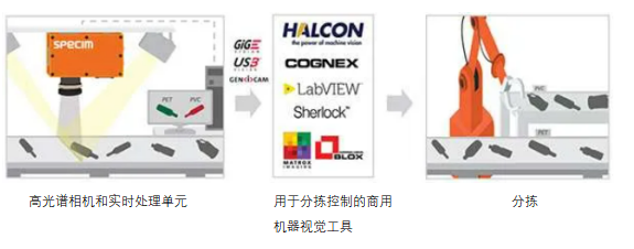 線掃描(推掃式)高光譜熱像儀可以安裝在現(xiàn)有和新的分揀線上,具有適當(dāng)?shù)恼彰骱蛯?shí)時(shí)數(shù)據(jù)處理解決方案,就像任何線陣掃描熱像儀一樣。逐個(gè)像素的材料識(shí)別結(jié)果可通過(guò)商業(yè)機(jī)器視覺(jué)系統(tǒng)的標(biāo)準(zhǔn)接口獲得。然后,結(jié)果可用于控制空氣噴嘴或揀選機(jī)器人。