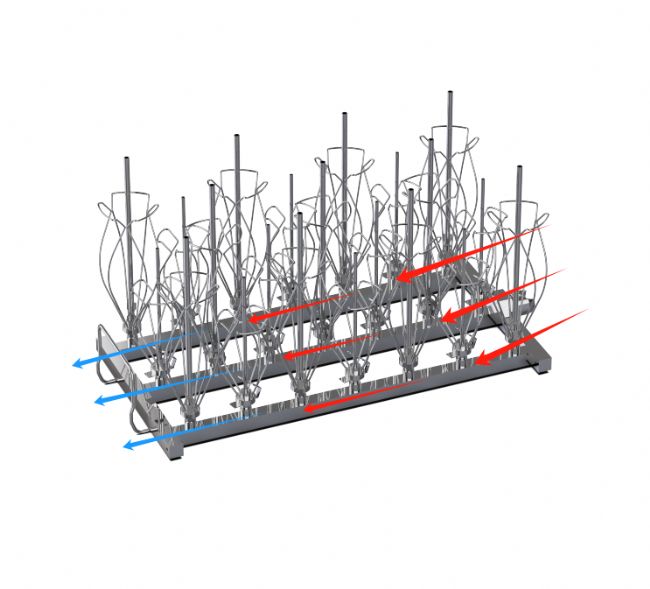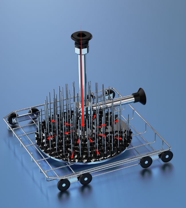 - 為了避免這種情況出現,需要盡量減小水壓的同時,保證每一個器皿受到近似相等的水壓。因此專用于實驗室洗瓶機的頂部進水欄架應運而生,減少不必要的管路,均勻分配每一跟噴針的水壓。