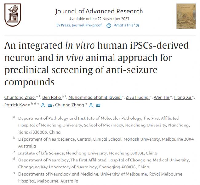 近日,南昌大學藥學院張春波團隊和Monash University神經科學系Patrick Kwan團隊在Journal of Advanced Research(IF=10.7)上發表了題為“An integrated in vitro human iPSCs-derived neuron and in vivo animal approach for preclinical screening of anti-seizure compounds”的研究論文,建立了整合體外人源誘導性多能干細胞(induced pluripotent stem cells, iPSCs)誘導神經元和體內動物模型進行抗癲癇藥物開發的新方法,該方法具有保留人類基因遺傳背景和高通量篩選的優勢,打破了傳統抗癲癇藥物開發過程中的物種影響和成本禁錮,有望提高藥物的篩選效率和成功率,通過該方法,研究者從14種天然化合物中鑒定出多種具有抗癲癇效果的化合物。南昌大學藥學院張春波教授和Monash University神經科學系Patrick Kwan教授為論文共同通訊作者,南昌大學藥學院博士研究生趙春芳和Monash University神經科學系研究員Ben Rollo博士為論文共同第一作者。