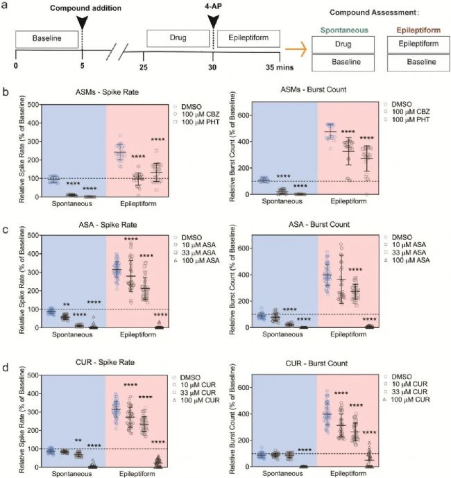 研究者利用一線抗癲癇藥物卡馬西平(carbamazepine, CBZ)和苯妥英鈉(phenytoin sodium,PHT)和已報道過具有抗癲癇潛力的天然化合物α-細辛腦(α-asarone,ASA)和姜黃素(curcumin,CUR)在24孔MEA板驗證了iPSCs誘導神經元癲癇模型識別抗癲癇化合物的適用性 (圖2)。