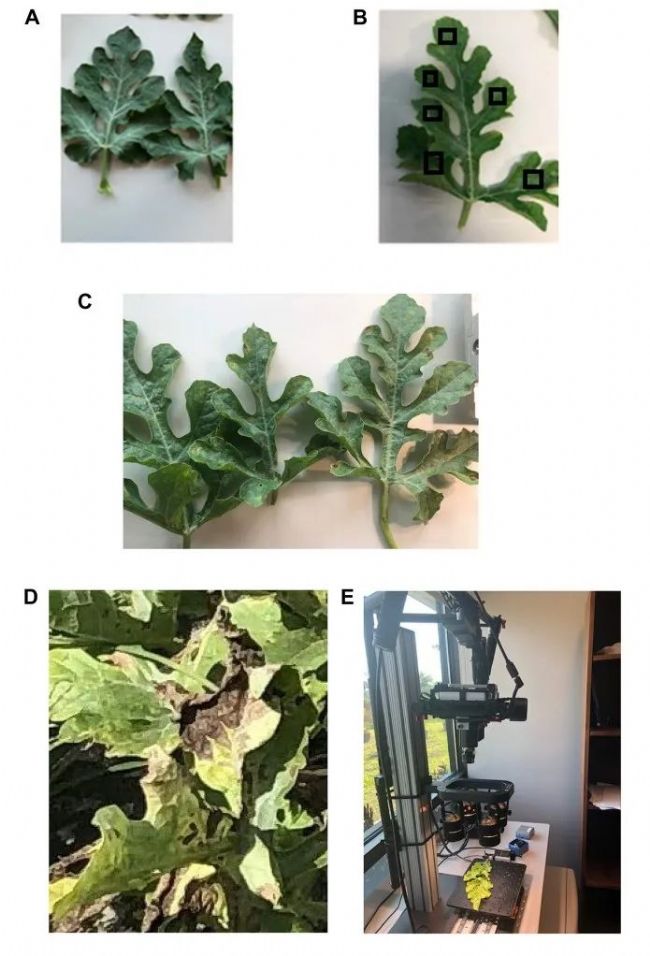 (A)健康西瓜葉片和不同嚴重程度階段的受DM感染的葉片(作為示例):(B)低(該圖像包括感興趣區(qū)域的示例);(C)中;(D)高。(E)Pika L高光譜相機在實驗室中收集高光譜數(shù)據(jù)。