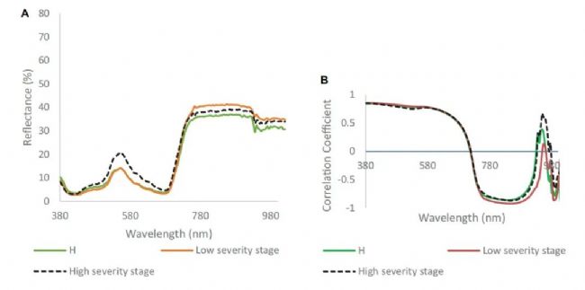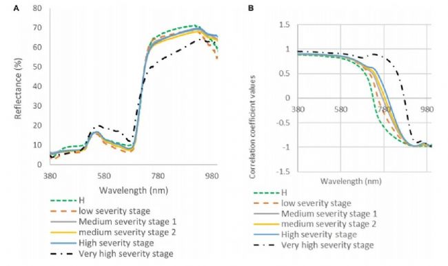 (A)田間收集高光譜圖像的光譜反射特征;(B)健康、低和高霜霉病嚴重程度階段西瓜植株的相關(guān)系數(shù)。