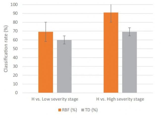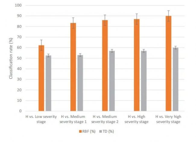 所選的最佳光譜VI對不同嚴重程度霜霉病的檢測和識別具有較高的特異性和敏感性。由于葉片組成的微小變化(與健康植物相比),低DS階段獲得了較低的分類結(jié)果。MLP方法在高和非常高DS階段(87-90%)獲得了最高的分類結(jié)果,而DT方法在所有DS階段獲得了較低的分類結(jié)果(與MLP相比)。一些VI可用于DS階段病害檢測和分類。利用高光譜成像識別最重要的VI來檢測和識別多個DS階段將進一步增強病害檢測的理解和特異性。未來的工作包括開發(fā)一種簡單且廉價的基于無人機的傳感器,該傳感器基于之前的研究和開發(fā),僅測量窄波段的光譜反射率(例如定制的多光譜相機),以特定波長為中心,用于田間DM早期檢測。