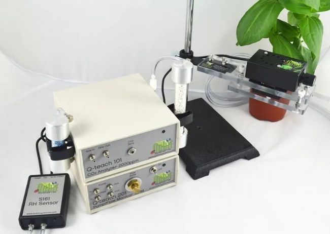 Q-teach Plant CO2軟件包包括Qubit的教學NDIR CO2分析儀、泵、流量計、可變LED光源、相對濕度傳感器和葉室,用于研究植物的光合作用、蒸散和(光)呼吸。可重新充氣的氣囊提供了穩定的環境空氣源,可用于混合不同水平的二氧化碳。可以提供額外的室來監測根系和土壤的呼吸。示例實驗包括: