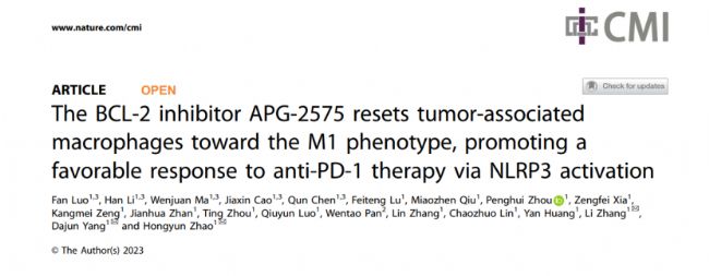 2023年12月7日,中山大學腫瘤防治中心趙洪云教授、楊大俊研究員、張力教授研究團隊在Cellular & Molecular Immunology雜志發表了題為“The BCL-2 inhibitor APG-2575 resets tumor-associated macrophages toward the M1 phenotype, promoting a favorable response to anti-PD-1 therapy via NLRP3 activation”的研究成果。