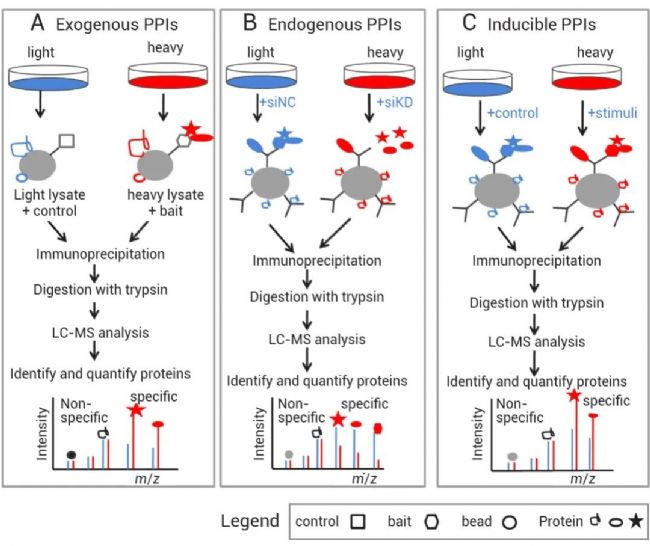 研究內(nèi)源性蛋白復(fù)合物時 (圖 2B),在輕或重培養(yǎng)基中生長的細(xì)胞中通過 RNAi 敲低所靶蛋白。然后用來自輕和重細(xì)胞裂解物混合物的相應(yīng)抗體對蛋白質(zhì)復(fù)合物進(jìn)行免疫沉淀[3]。