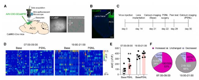 研究人員利用部分坐骨神經結扎(PSNL)疼痛小鼠模型模擬疼痛和失眠的共患。通過光纖鈣成像技術記錄晝夜節律時間ZT0–ZT2(上午7點到9點,為PSNL模型小鼠失眠階段)和ZT12–ZT14(晚上7點到9點,為PSNL模型小鼠和正常小鼠覺醒階段)ACC- PNs活性,結果發現PSNL模型小鼠在失眠階段ACC- PNs活性增強,在覺醒階段無變化。電生理實驗也證明PSNL模型小鼠在失眠階段ACC- PNs微小興奮性突觸后電流增強。單獨使用催眠藥(安定)或鎮痛藥(嗎啡)均不影響PSNL模型小鼠失眠階段ACC- PNs活性變化,但在使用聯合催眠和鎮痛的藥物可顯著降低失眠階段ACC- PNs活性。