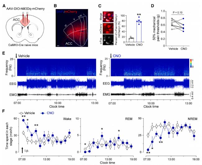 為進一步證實ACC-PNs活性在慢性疼痛誘發失眠中的重要性,他們通過病毒載體工具特異性誘導ACC腦區興奮性神經元死亡后,可阻斷慢性疼痛誘發失眠的發生。慢性激活正常小鼠ACC- PNs后可增加覺醒時間,減少非快速眼動睡眠時間,表現出睡眠障礙。
