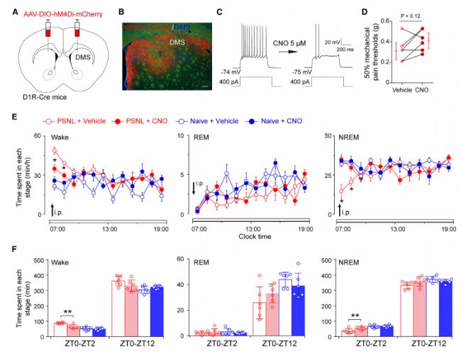圖3:DMS D1-MSN神經元調控慢性疼痛誘發的失眠
