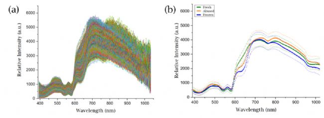 用于構建肉樣本分類模型的高光譜數據立方體中的光譜。(a) 實驗數據的完整光譜;(b) 每個實驗組的平均光譜(實線)以及加減標準差后的光譜(虛線)。