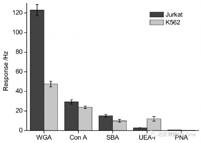 研究人員分別將兩種不同類型的懸浮細胞(人急性髓細胞白血病細胞K562和人急性淋巴細胞白血病細胞Jurkat)捕獲到芯片表面,制得QCM懸浮細胞芯片,并對這兩種細胞表面的糖基化情況進行了研究。如圖3所示,WGA對Jurkat細胞具有較高的響應(yīng)值(123 Hz)說明Jurkat細胞表面具有高表達量的N-乙酰基葡糖胺,而K562細胞表面具有較低水平的N-乙酰基葡糖胺(48 Hz)。Con A和SBA對Jurkat細胞的響應(yīng)值分別為:29 Hz和15 Hz,對K562細胞的響應(yīng)值分別為24 Hz和10 Hz,兩者相差不大,說明兩種細胞表面葡萄糖/甘露糖和N-乙酰基半乳糖胺表達量較接近。UEA-I對K562細胞的響應(yīng)值為12 Hz,而對Jurkat細胞的響應(yīng)值只有2.8 Hz,說明K562細胞表面較Jurkat細胞表面具有較高水平的L-巖藻糖表達。PNA對兩種細胞的響應(yīng)值均很弱說明兩種細胞表面的只有微量的半乳糖表達。由此可見,不同的凝集素對不同的細胞的響應(yīng)值差異表明了細胞表面的糖基化差異情況。
