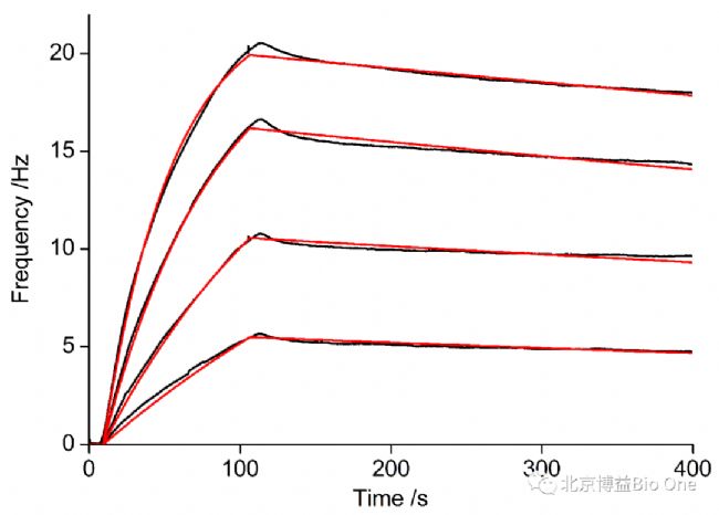 如圖4所示,研究人員通過檢測一系列濃度的凝集素SBA與K562細胞的相互作用(檢測凝集素與細胞的結(jié)合過程105 s、解離過程295 s)。結(jié)合-解離曲線用Attana分析軟件進行擬合分析,獲得SBA與K562細胞相互作用的動力學(xué)數(shù)據(jù):結(jié)合速率常數(shù)kon = 7.56 × 104 M-1 s-1、解離速率常數(shù)koff = 3.89 × 10-4 s-1,以及親和常數(shù)KD = 5.15 nM。(圖中黑色曲線為實際所測SBA與K562細胞相互作用曲線,紅色曲線為軟件擬合曲線)