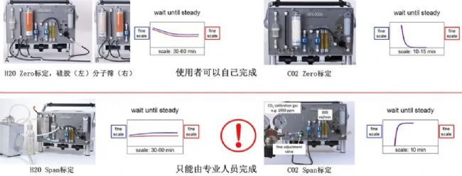 標定分為Zero標定和Span標定,CO2和H2O的Zero標定可以分別用堿石灰和干燥劑將密閉氣路內CO2和H2O完全吸附來完成,使用者根據軟件中的流程提示自己即可操作。CO2和H2O的Span標定則需要已知濃度的氣罐和冷阱,只能由專業工程師來完成。什么時候需要標定呢?在Mode ZP模式下,dCO2ZP>2ppm時需標定CO2零點,dH2OZP>200ppm時需要標定H2O零點。對于紅外分析器的長期維護,建議Span標定的周期是不超過1年,GFS-3000光合儀自安裝調試后起可享受一次免費標定!