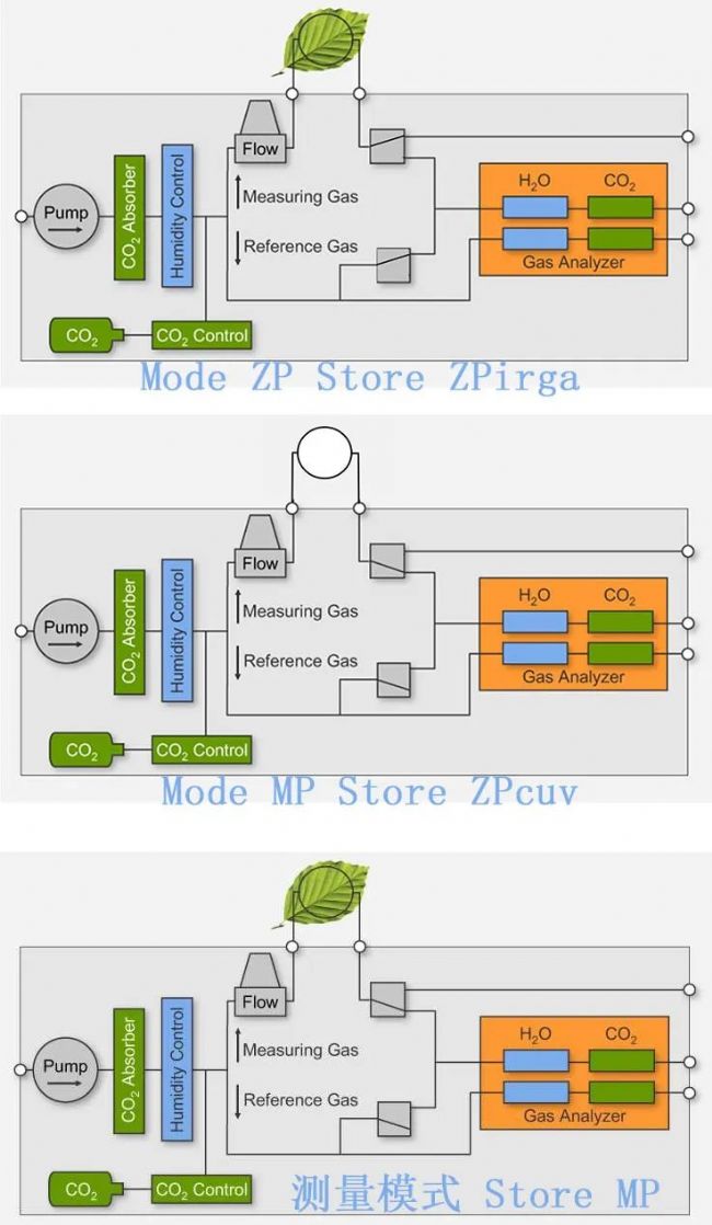 分析器調零和前面講的分析器標定是兩個概念。如果把紅外氣體分析器比作天平,標定即為用標準砝碼校準天平,調零則相當于稱量前去皮。無論是分析器調零還是分析器標定都必須在機器充分預熱后進行。GFS-3000的分析器調零分兩步:Mode ZP調零和Mode MP調零。Mode ZP 模式調零消除的是參比分析器(Analyser Ref)和樣品分析器(Analyser Sam)之間的差值,需要在dCO2和dH2O曲線穩定后計數,此時存的是ZPirga;Mode MP模式調零消除的是參比分析器(Analyser Ref)和樣品分析器(Analyser Sam)+葉室氣路(Cuvette)之間的差值,同樣需要在dCO2和dH2O曲線穩定后計數,此時存的是ZPcuv。調零結束后即可開始測量。