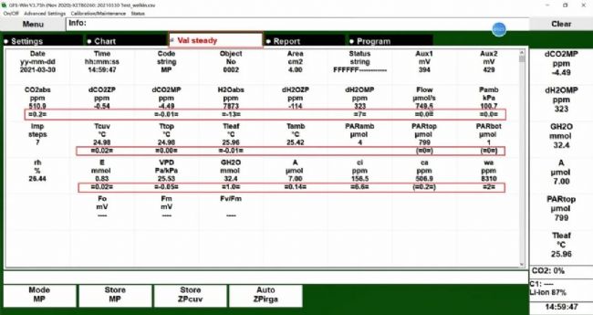進階操作:通過點擊 Value選項卡三次,切換至Val Steady界面。在此界面下,GFS-3000會根據預設的穩定判定標準判斷測量是否達到穩態。等A值下面出現=號時,點擊屏幕下方常用命令區第二個按鈕Store MP,存儲數據。如果Val Steady界面所有數據都穩定了,Val Steady會變成紅色,此時可以果斷點擊Store MP。預設的穩定判斷標準可以通過主菜單-高級設置-穩定測量設置進行修改,修改后的標準記得保存。后續會根據新加載的標準進行判定測量是否已經達到穩定。所有保存的數據會顯示在Report界面并寫入最初創建的文件。